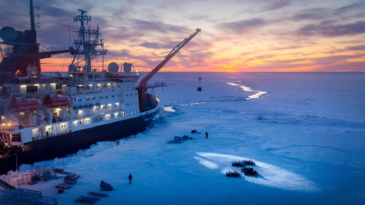 Am 20. September 2019 in Tromsø startet der deutsche Forschungseisbrecher Polarstern in Richtung Nordpolarmeer. Nach einer Umrundung des skandinavischen Nordkaps geht es durch die eisfreie Barentssee, über der Polarlichter flimmern. Mit gut 13 Knoten durchquert die Polarstern entlang der Nordostpassage die Karasee und umrundet dann das Kap Tscheljuskin, vorbei an den russischen Inselgruppen Nowaja Semlja und Sewernaja Semlja. Durch sechs Zeitzonen bewegt sich das Schiff auf dem Weg zum arktischen Meereis. Als sie es erreichen, wird eine passende Eisscholle gesucht, in die sie sich festfrieren lassen. Das muss vor Einbruch der Polarnacht geschehen, denn dann ist es für ein halbes Jahr dunkel. Die auserkorene Scholle ist 2.5 mal 3.5 Kilometer groß und hat ein sehr stabiles Zentrum. Perfekt! Die Maschinen gehen in den Leerlauf und der Kapitän trägt ins Logbuch die Koordinaten 85°04.582´ Nord und 134°25.769´ Ost ein.